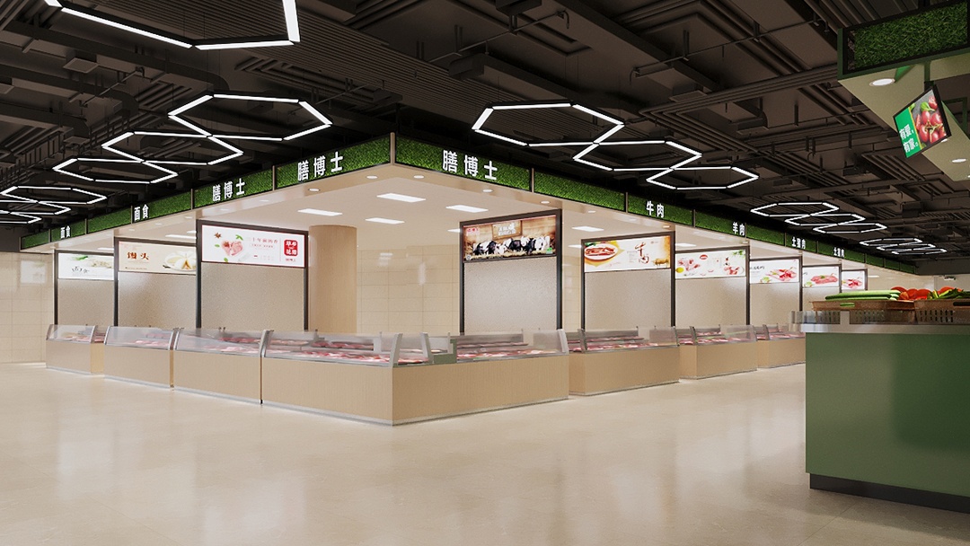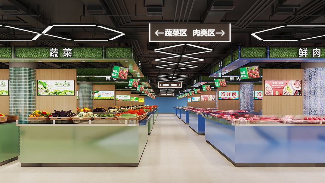 杭州生鮮超市裝修設(shè)計(jì),巧妙運(yùn)用色彩分區(qū),以藍(lán)色勾勒生鮮區(qū),綠色暈染蔬果區(qū),打造出別具一格的購(gòu)物空間。踏入生鮮區(qū),靜謐而深邃的藍(lán)色調(diào)撲面而來(lái),營(yíng)造出海洋般的清涼氛圍。冷柜、展示架皆以藍(lán)色為主,與各類(lèi)鮮活的海鮮、肉類(lèi)相互映襯,凸顯品質(zhì)與新鮮。移步蔬果區(qū),清新的綠色瞬間讓人心曠神怡。生機(jī)勃勃的綠植裝飾與翠綠的蔬果相得益彰,仿佛置身于田園之中。合理的陳列布局,讓每一顆果實(shí)、每一把蔬菜都能盡情展現(xiàn)其飽滿(mǎn)姿態(tài)。藍(lán)綠交織的設(shè)計(jì),不僅為顧客帶來(lái)視覺(jué)上的享受,更引導(dǎo)著購(gòu)物動(dòng)線(xiàn)。在這里,每一次挑選都是與自然的親密對(duì)話(huà),開(kāi)啟一場(chǎng)鮮活、健康的購(gòu)物之旅。