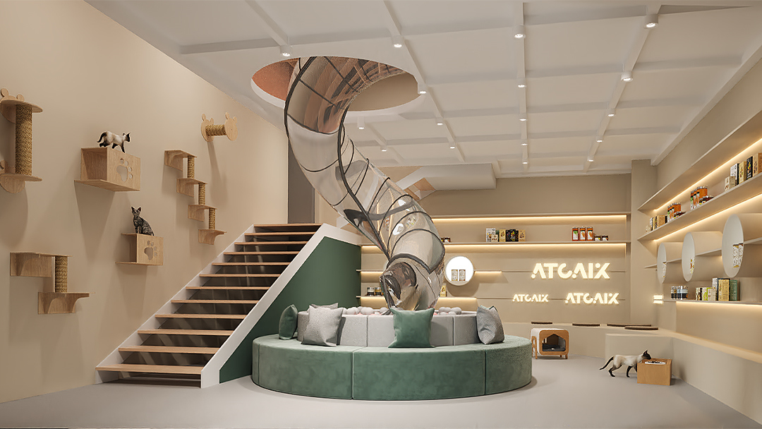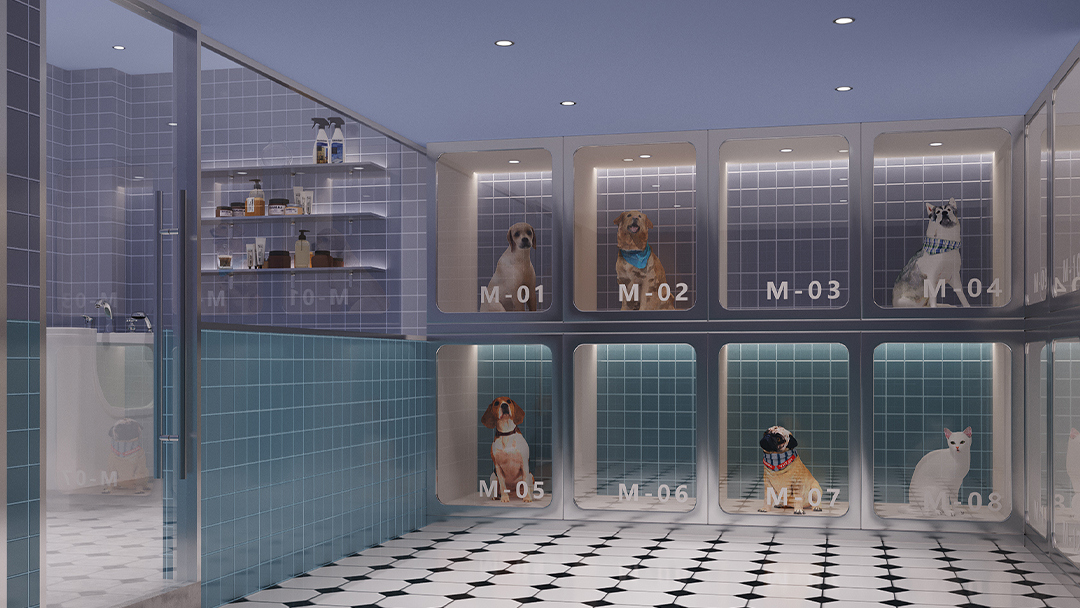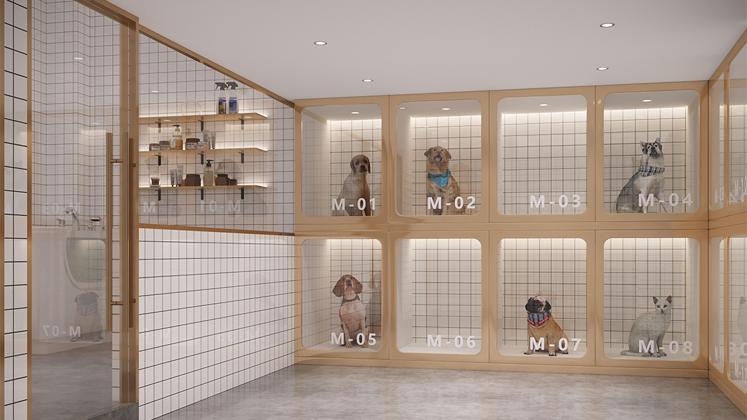 采用“隱形收納+模塊化家具”系統(tǒng),將美容臺(tái)、寄養(yǎng)艙、商品陳列區(qū)整合為可靈活調(diào)整的單元。例如犬類護(hù)理區(qū)配備可升降不銹鋼操作臺(tái)與隱藏式吹水機(jī)支架,貓柜則采用雙層結(jié)構(gòu)搭配磁吸式食盆設(shè)計(jì),最大化利用有限空間。