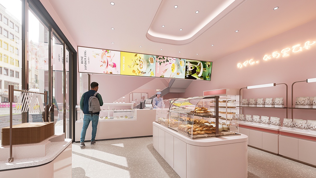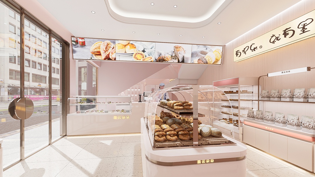 杭州網(wǎng)紅烘焙店裝修設(shè)計(jì)亮點(diǎn),本案以“甜蜜劇場(chǎng)”為概念,打造沉浸式烘焙社交空間。弧形島臺(tái)與翻糖藝術(shù)裝置形成視覺(jué)焦點(diǎn),墻面采用漸變色手工肌理漆,呼應(yīng)馬卡龍主題色彩。臨街面設(shè)計(jì)折疊全景窗,搭配外擺休閑區(qū)增強(qiáng)互動(dòng)感。重點(diǎn)打造“透明后廚長(zhǎng)廊”與“自選原料市集”,結(jié)合暖調(diào)軌道射燈與定制復(fù)古面包陳列架,在強(qiáng)化生產(chǎn)可視性與產(chǎn)品新鮮度的同時(shí),構(gòu)建高傳播性的打卡場(chǎng)景,實(shí)現(xiàn)功能與美學(xué)的雙向賦能。