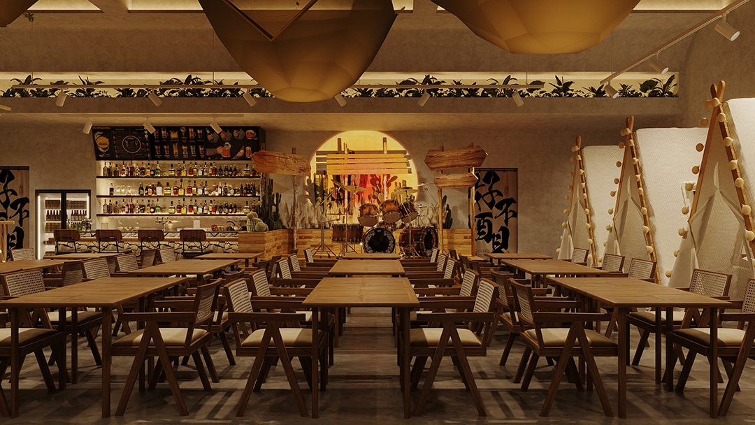 杭州露營風戶外酒吧裝修設計,本案以“都市曠野聚落”為概念,將山系美學植入城市夜生活。空間鋪陳礫石地與仿真草坪,搭配復古煤油燈串與天幕系統(tǒng)。中心區(qū)域架設篝火裝置與折疊椅環(huán)座,吧臺由改裝露營車箱體構成。墻面運用防銹鋼板與回收木料,嵌入戶外裝備展示架與多功能電源接口。頂部懸掛星空投影網(wǎng),結合隱藏式取暖設備與驅(qū)蚊系統(tǒng),營造全天候可用的沉浸式戶外社交場景。