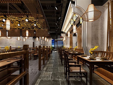 博妍裝飾突破傳統裝修思維,將餐飲空間視為品牌故事的立體化呈現。例如為杭州某川湘菜館設計的“煙火隱于市”主題空間,通過提取東方建筑中的拱形、柱體元素,結合現代洄游動線,打造出半開放式包間與巨幅落日天幕燈裝置。空間中質樸的夯土墻面、紋理感柱體與摩登中古臺燈形成沖突美學,既傳遞“家常菜精致化”的品牌理念,又成為顧客自發傳播的社交貨幣。。
