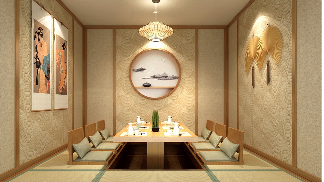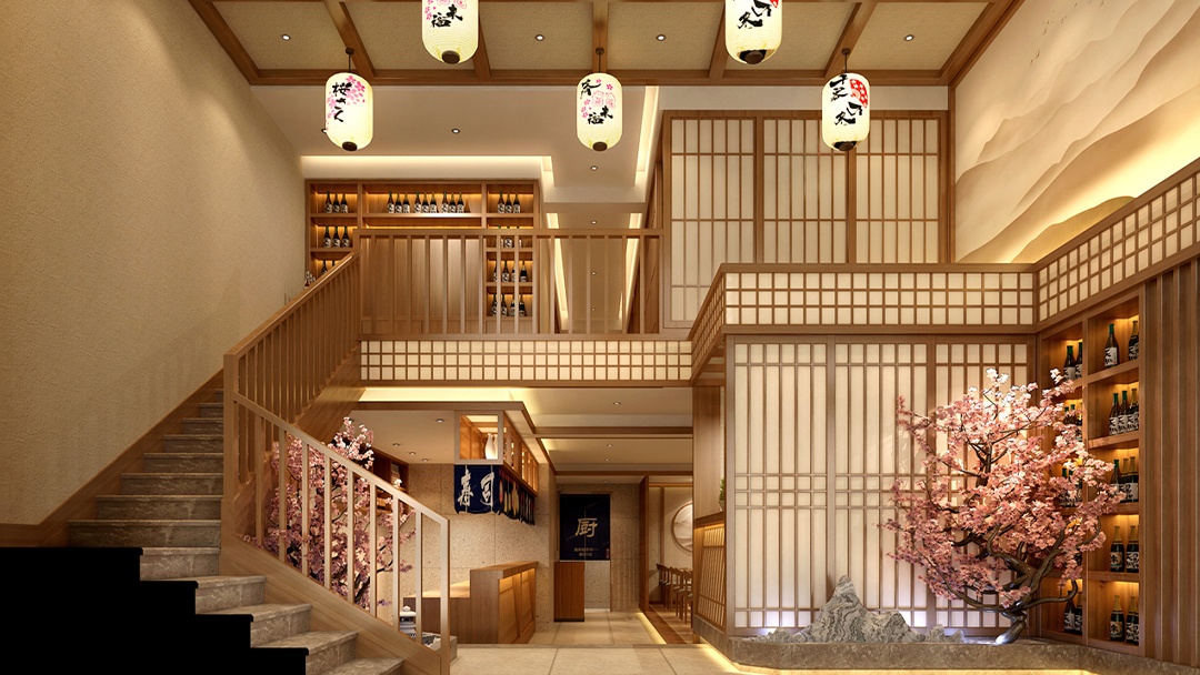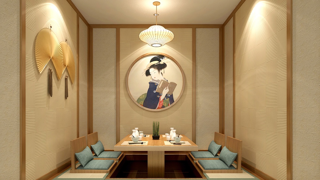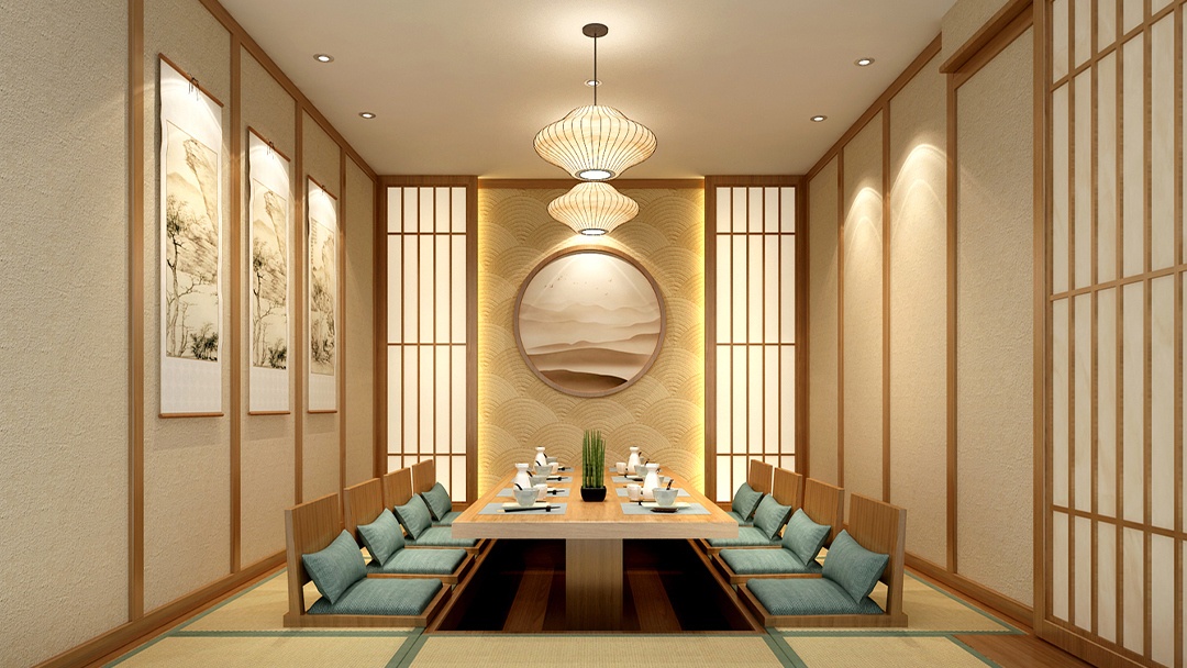 :選用原木、竹編、素色涂料等天然材料,搭配暖黃燈光與庭院枯山水造景,營造靜謐雅致的用餐環境。