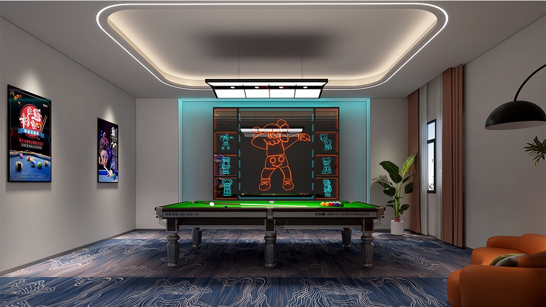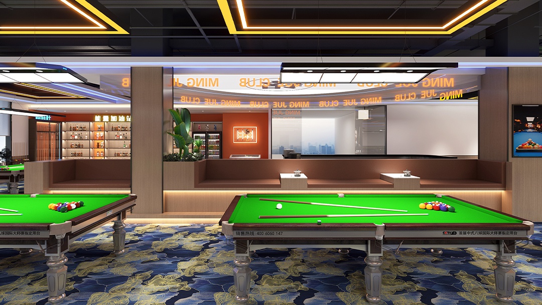 針對臺球廳的特殊性,博妍裝飾從五大維度構建核心競爭力:在空間規劃上,采用“中央集中式”或“周邊環繞式”動線設計,確保球桌間距1.5-1.8米、主通道≥1.8米,并通過鏡面/綠植隔斷劃分功能區;在燈光系統方面,配置4000K色溫LED無影燈,照度300-500勒克斯,搭配3000K暖光筒燈,既滿足擊球精準需求,又通過光影層次延長顧客停留時間;材質選擇上,地面采用短絨地毯或PVC防滑地板,墻面結合吸音板材與軟包工藝,配合礦棉板吊頂優化聲學環境;主題營造中,擅長將英倫風、賽博朋克等元素與臺球文化融合,例如設置涂鴉互動墻、賽事影像展示區,甚至嵌入電競角實現多業態聯動;智能化配套則涵蓋在線預約、自助結賬系統,以及可調節氛圍的音響設備,全面提升運營效率與用戶體驗。