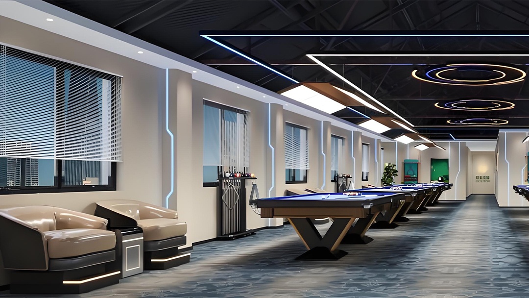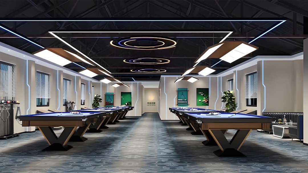 針對臺球廳需求,博妍從三大維度構建解決方案:空間布局上,嚴格遵循行業標準,確保球桌間距1.5米以上、主通道寬度合理,實現比賽區、休息區、水吧等功能分區的科學動線分離;環境營造方面,采用4000K中性光LED無影燈系統,搭配深色吸音墻面與PVC防滑地板,通過聲學優化將噪音控制在55分貝以下;增值服務區則整合智能預約系統、自助結算終端及會員管理平臺,提升運營效率。