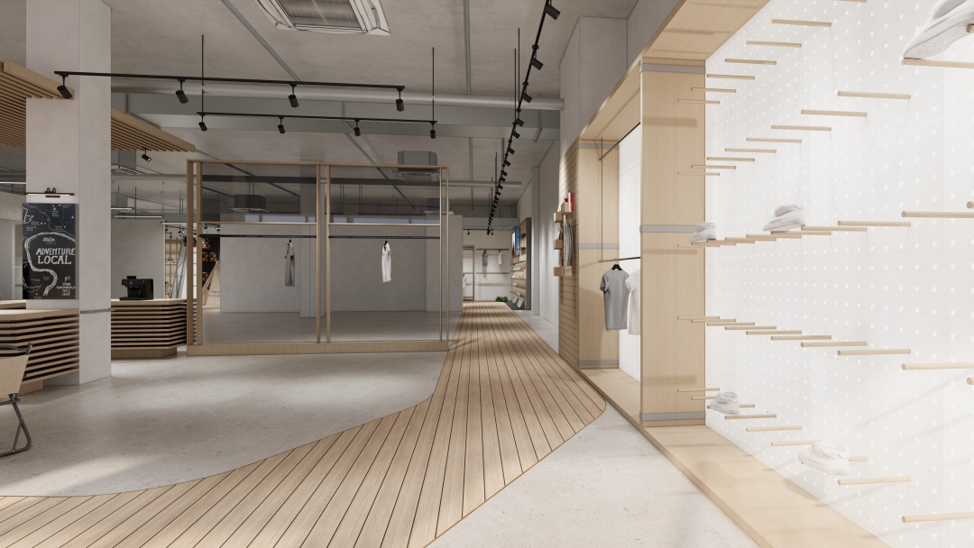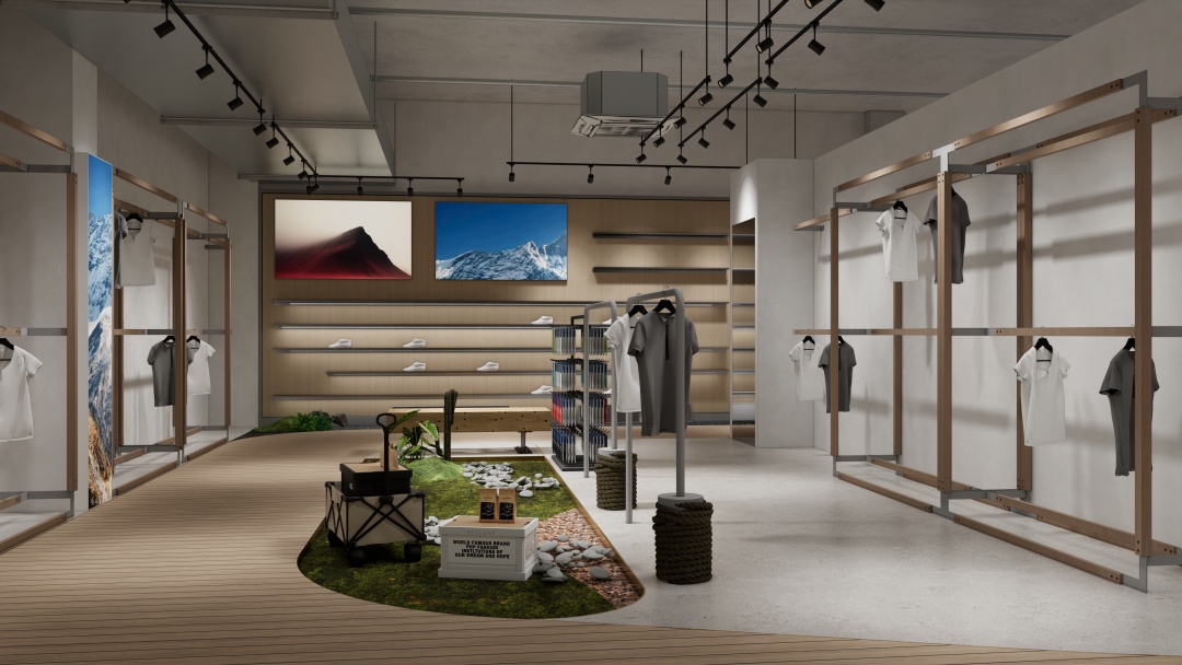 - 功能分區優化:設置動態展示區與靜態試衣間,通過高低錯落平臺劃分區域,既保證顧客探索動線的流暢性,又滿足裝備試用的專業需求;