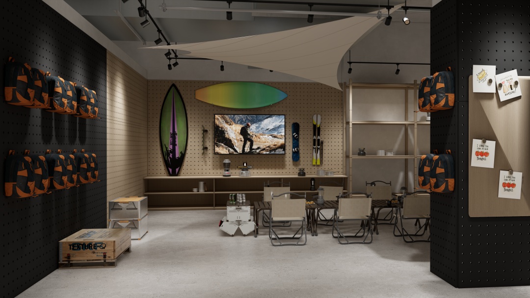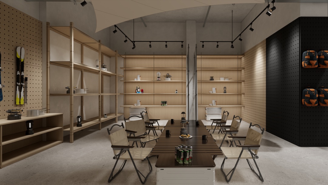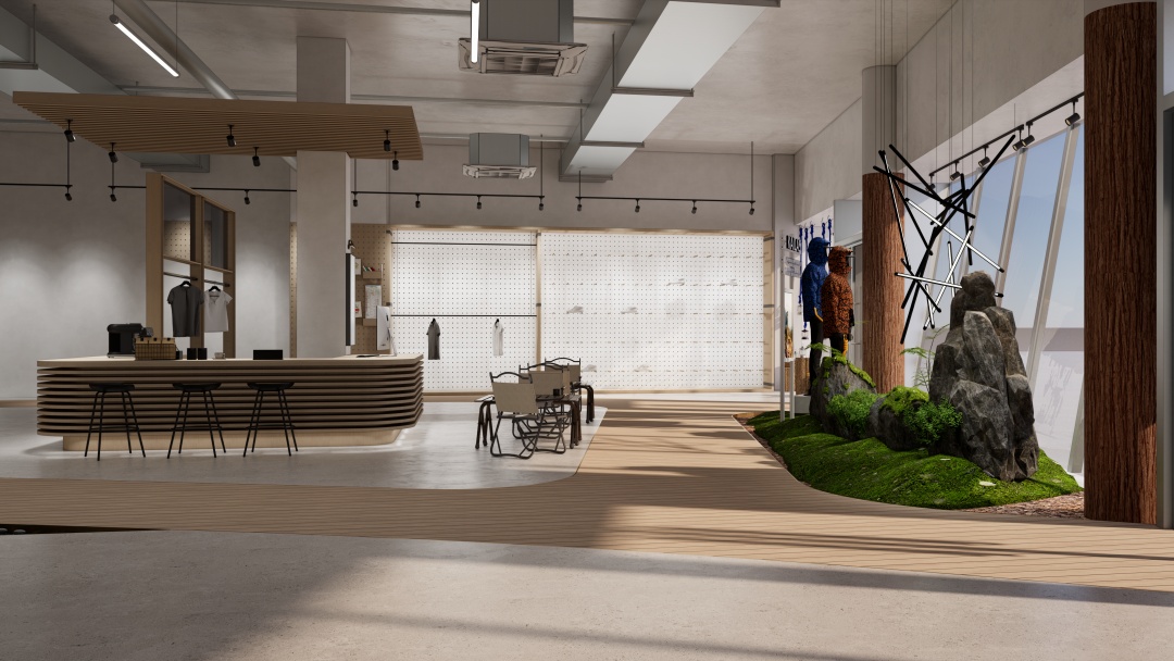 - 沉浸式場景營造:運用巖石紋理、綠植墻及仿木質元素還原自然氛圍,搭配可調節色溫的射燈模擬不同時段光線,強化產品在登山、徒步等場景中的適配性;