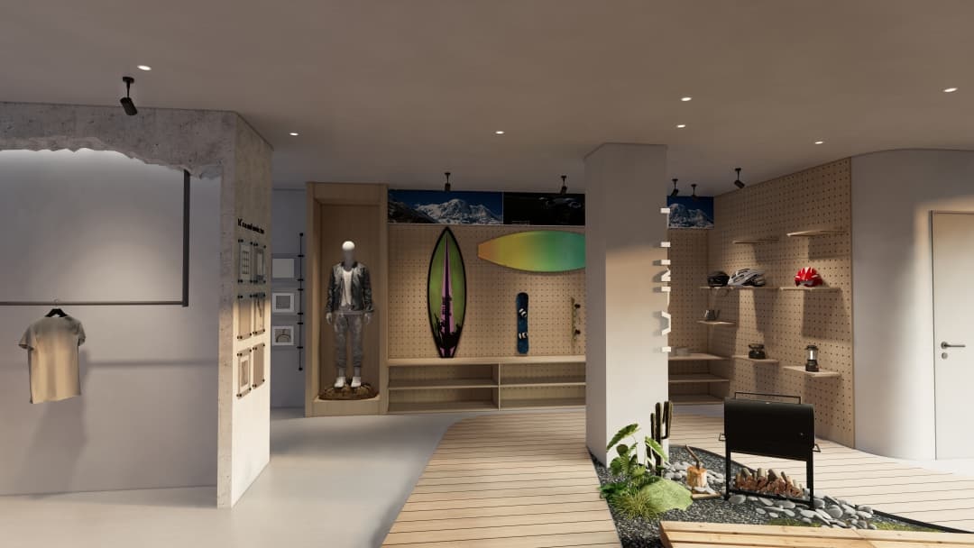 - 功能分區優化:設置動態展示區與靜態試衣間,通過高低錯落平臺劃分區域,既保證顧客探索動線的流暢性,又滿足裝備試用的專業需求;