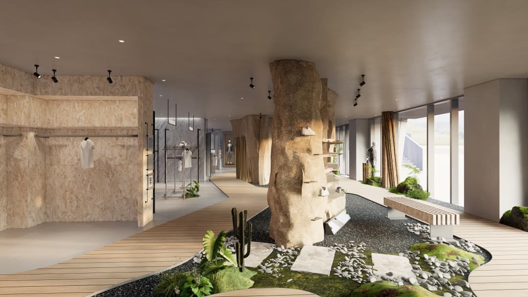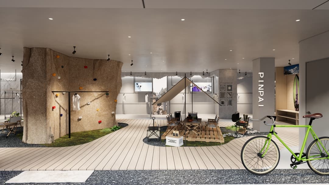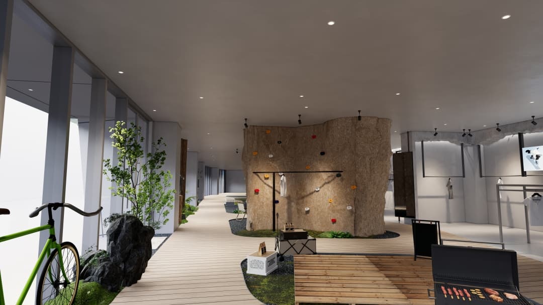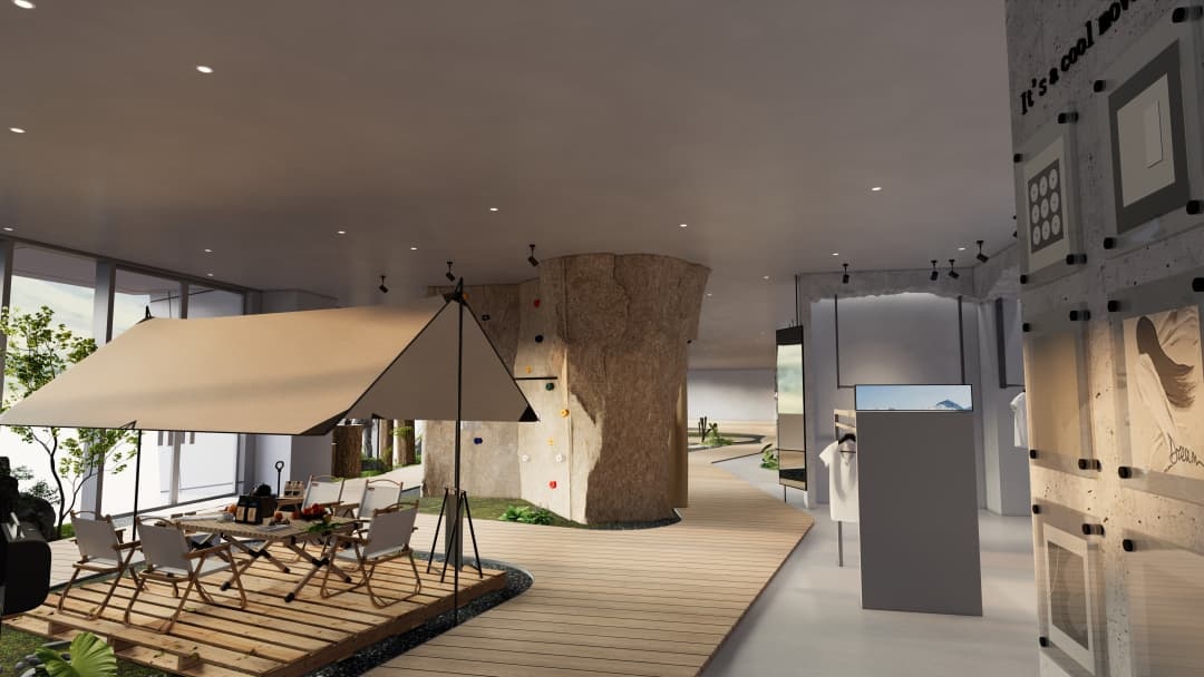 - 沉浸式場景營造:運用巖石紋理、綠植墻及仿木質元素還原自然氛圍,搭配可調節色溫的射燈模擬不同時段光線,強化產品在登山、徒步等場景中的適配性;