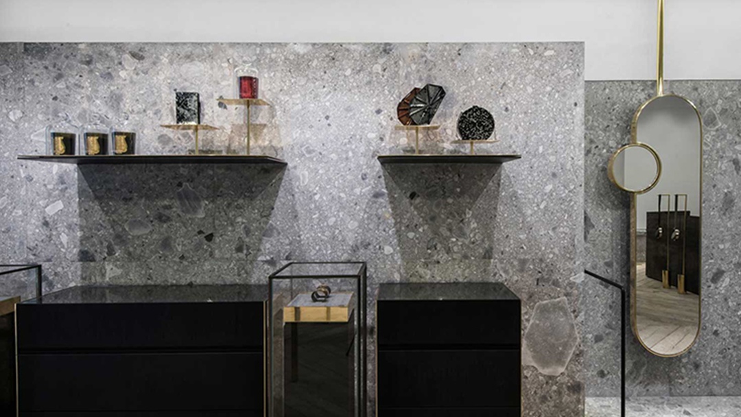 休息區,布置著灰色調的柔軟沙發與精致茶幾,營造出靜謐舒適的氛圍,讓顧客在挑選珠寶之余,能悠然放松身心。店內,還巧妙融入杭州的江南元素,如以水墨灰裝飾局部墻面,增添一抹東方韻味。